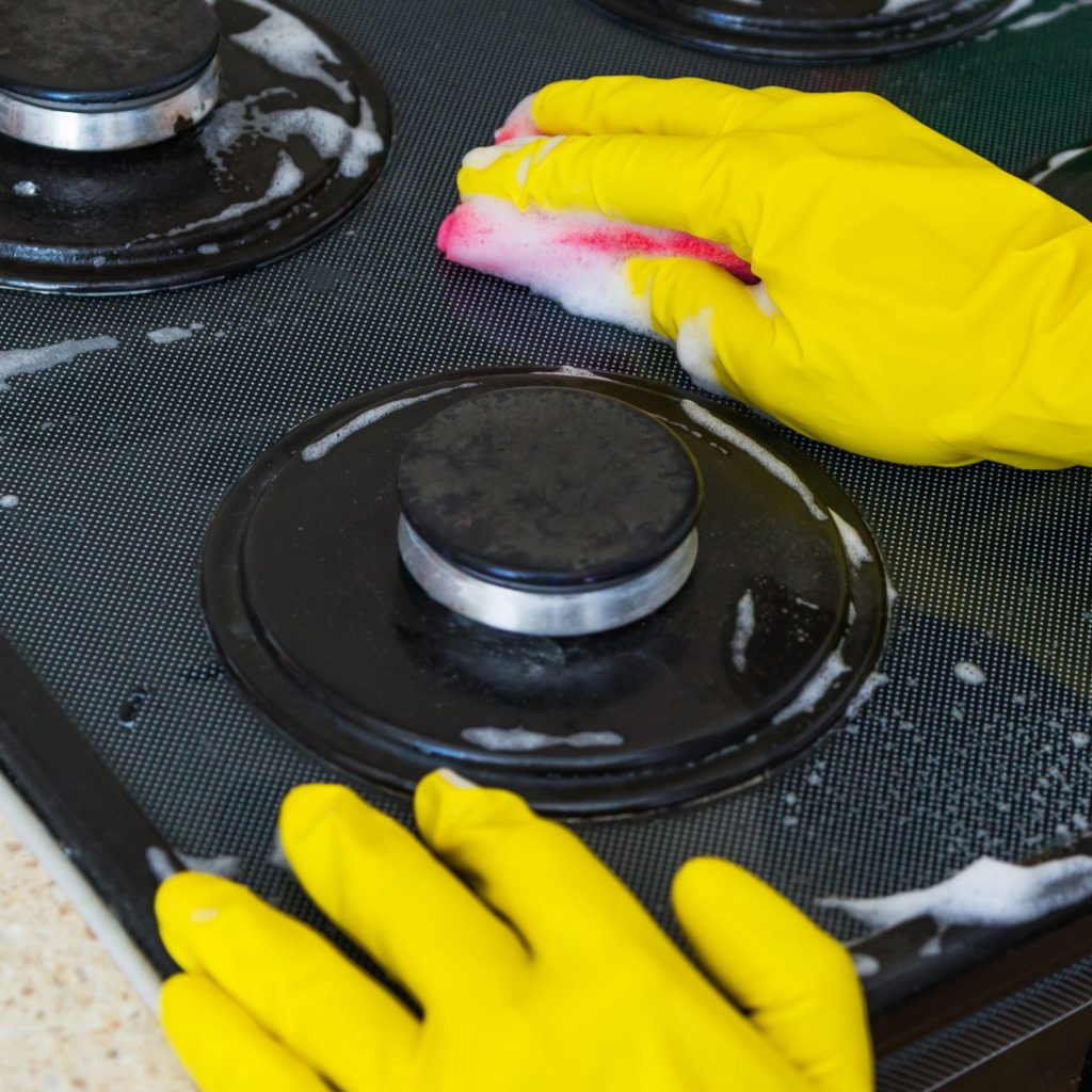 Home → Gloves – Cooking Station → Housewife in colored rubber gloves washes a gas stove with detergent in the kitchen