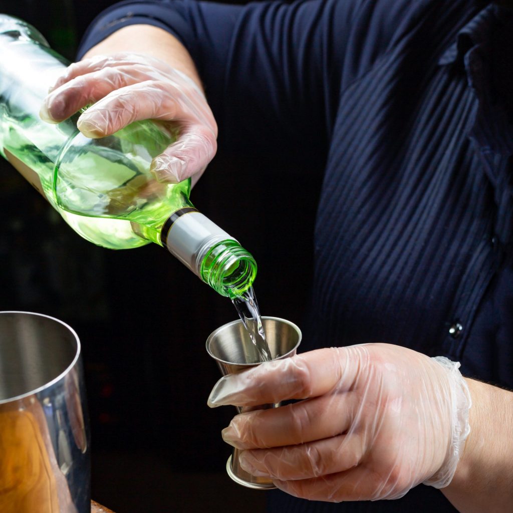 Making an alcoholic cocktail. The bartender stands behind the bar in gloves and pours a portion of alcohol from a bottle into a measuring cup. Close up, vertical layout