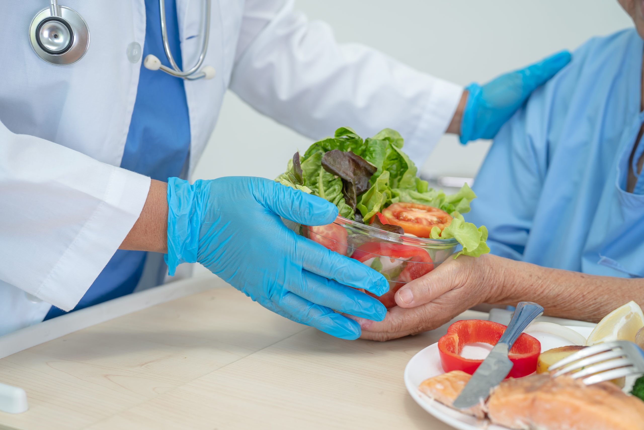 Asian senior or elderly old lady woman patient eating breakfast vegetable healthy food with hope and happy while sitting and hungry on bed in hospital.