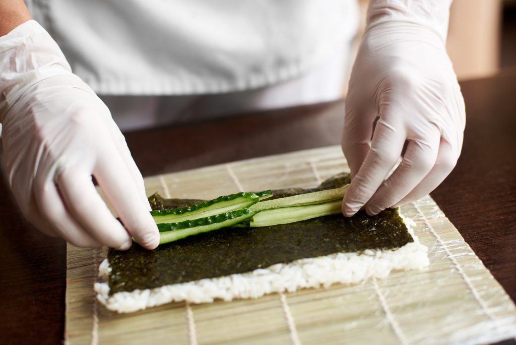 Close-up view of process of preparing rolling sushi. Nori, white rice and cucumber on bamboo mat. Chef’s hands in gloves starts cooking sushi rolls